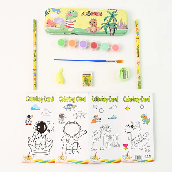 ๐ฆ All-in-One Creative Kit โ Includes pencil box, 2 pencils, eraser, sharpener, dino pencil cap, coloring cards, and 6-color paint palette