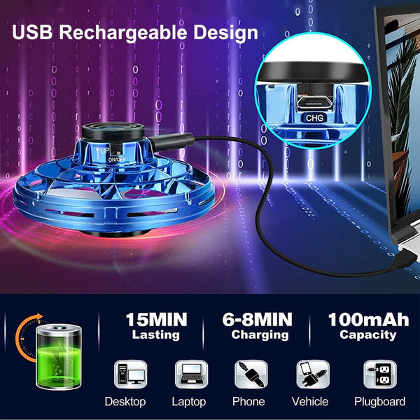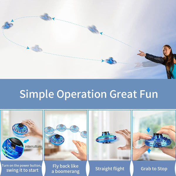 Built-in sensors guide smooth flying and 360° spins. Colorful LED lights make it fun, especially in the dark.